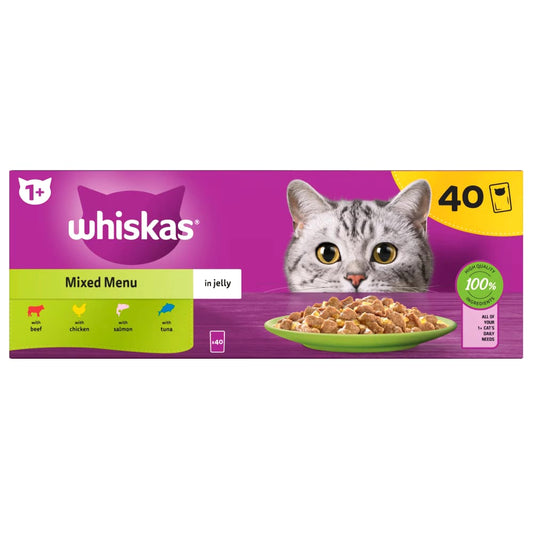 40 X 85G Whiskas 1+ Mixed Menu Mixed Adult Wet Cat Food Pouches in Jelly