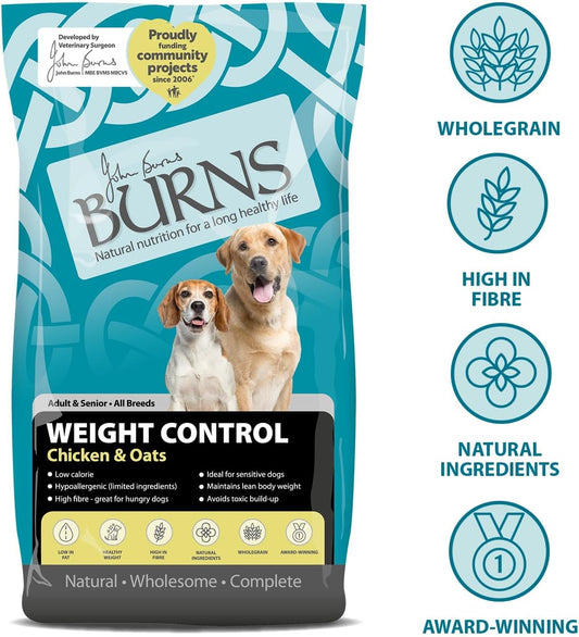 Burns Pet Nutrition Hypoallergenic Complete Dry Dog Food Adult and Senior Dog Weight Control Chicken and Oats 12 kg